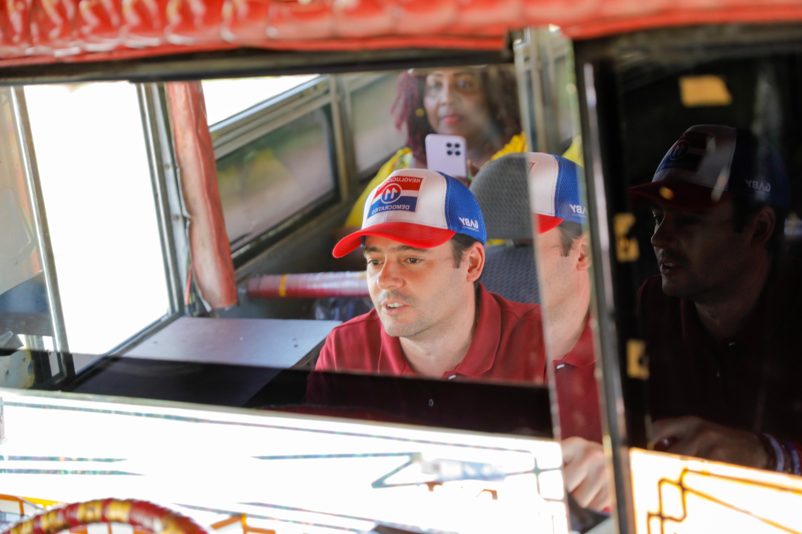 El candidato presidencial, que lidera el conglomerado político más grande del país, disfrutó tanto el momento que se subió al bus, se apoderó del timón y condujo, mientras los pasajeros estaban emocionados y algunos gritaban, «¡Vamos, Gaby, gancho al 1!».